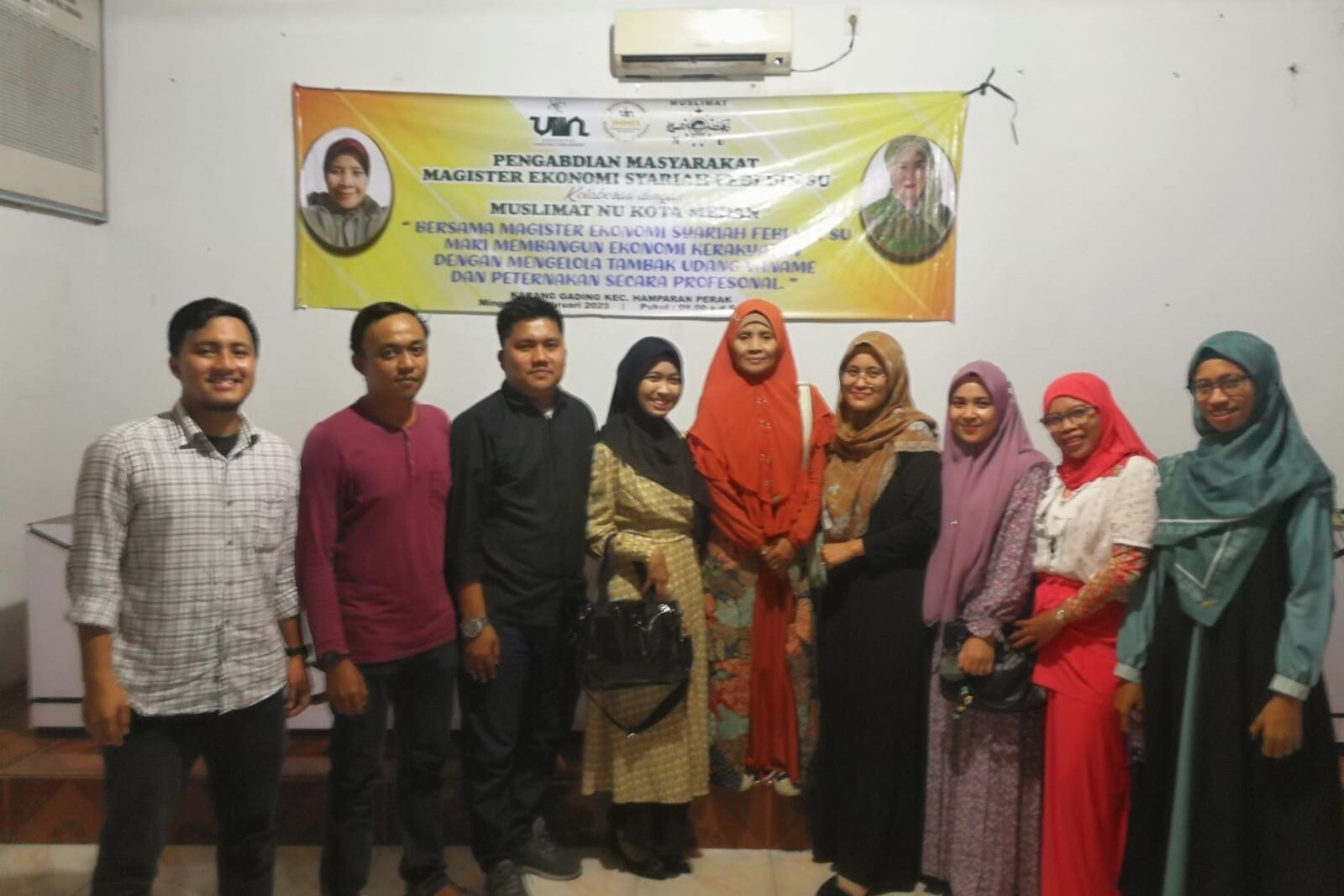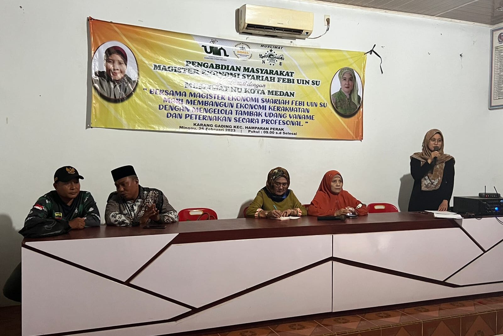 Pengabdian kepada Masyarakat (PKM) Magister Ekonomi Syariah FEBI UINSU di Deli Serdang ini dilaksanakan dengan berkolaborasi bersama Muslimat NU Kota Medan. PKM dilaksanakan di Desa Karang Gading, Kecamatan Hamparan Perak, Kabupaten Deli Serdang pada Ahad, 26 Februari 2023. Adapun tema yang diangkat yakni “Bersama Magister Ekonomi Syariah FEBI UINSU Mari Mebangun Ekonomi Kerakyatan dengan Mengelola Tambak Udang Vaname dan Peternakan secara Profesional”.